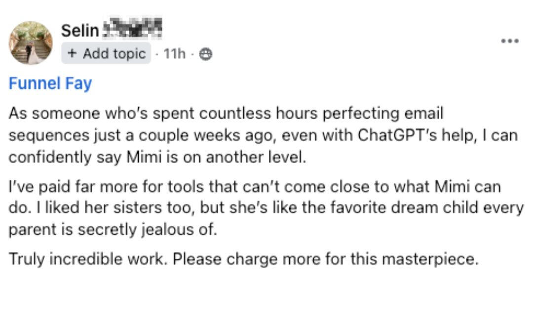 🚫 Left you with a “meh” welcome sequence and no idea what comes nextYou don’t need another tool that spits out generic content.You need a system.Mimi gives you:
