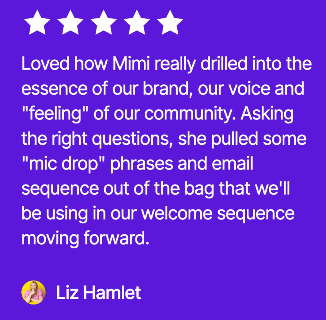 ✅ A strategy to nurture and convert, not just communicate✅ Your voice, amplified, not overwritten✅ A done-with-you process that gets it done fast (and done right)That’s Mimi.